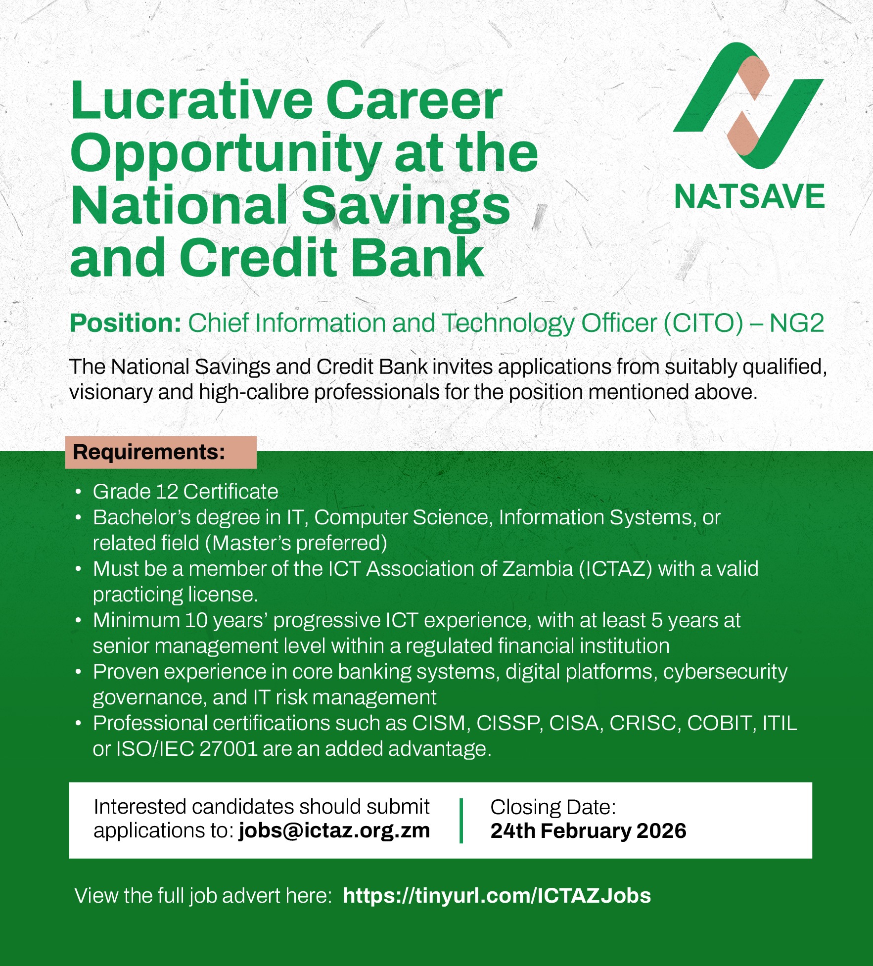 Find attached the job details: https://ictaz.org.zm/wp-content/uploads/2026/02/JOB-OPPORTUNITY-Chief-Information-and-Technology-Officer.pdf